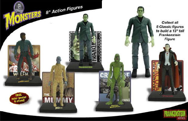 Very hard to find 5-figure Universal Monsters set. Each figure comes individually packaged in coffin-shaped bubble-pack and includes one or more body parts needed to build a 14" Frankenstein Monster!